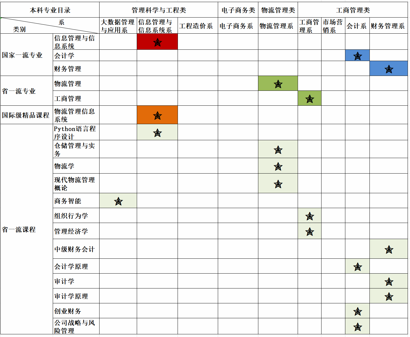 学院目前拥有4个一级学科类9个本科专业:管理科学与工程类3个本科专业(大数据管理与应用、信息管理与信息系统、工程造价)、物流管理与工程类1个本科专业(物流管理)、工商管理类4个本科专业(工商管理、市场营销、会计学、财务管理)、电子商务类1个本科专业(电子商务)。其中,会计学2020年获批国家一流专业建设点立项,财务管理获批2021年国家一流专业建设点立项,信息管理与信息系统被评为湖北省高等学校本科品牌专业,并于2019年入选湖北省首批“双一流”专业建设点,2022年入选国家级一流专业建设点。物流管理被评为湖北省战略新兴建设专业,并与工商管理入选省一流专业建设点。