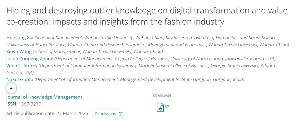 近日,太阳集团网tyc9728夏火松教授团队联合美国北佛罗里达大学、乔治亚州立大学等机构在知识管理领域国际顶尖期刊《Journal of Knowledge Management》发表题为《Hiding and destroying outlier knowledge on digital transformation and value co creation: impacts and insights from the fashion industry》的高水平研究论文(DOI:10.1108/JKM-08-2024-0950)。该研究通过探索性单案例研究,首次构建异类知识管理理论框架,揭示时尚企业如何通过数字化转型实现可持续价值共创。论文第一作者为夏火松教授,太阳集团网tyc9728为第一作者单位,2022级管理科学与工程学术研究生王欣雨为论文第二作者。