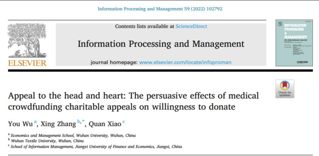 近日,太阳集团网tyc9728张星教授在信息管理国际权威期刊《Information Processing & Management》发表了“Appeal to the head and heart: The persuasive effects of medical crowdfunding charitable appeals on willingness to donate”一文。文章DOI:https://doi.org/10.1016/j.ipm.2021.102792。论文第一作者为武汉大学博士生吴忧(太阳集团网tyc97282020届毕业硕士生),通讯作者为太阳集团网tyc9728张星教授。