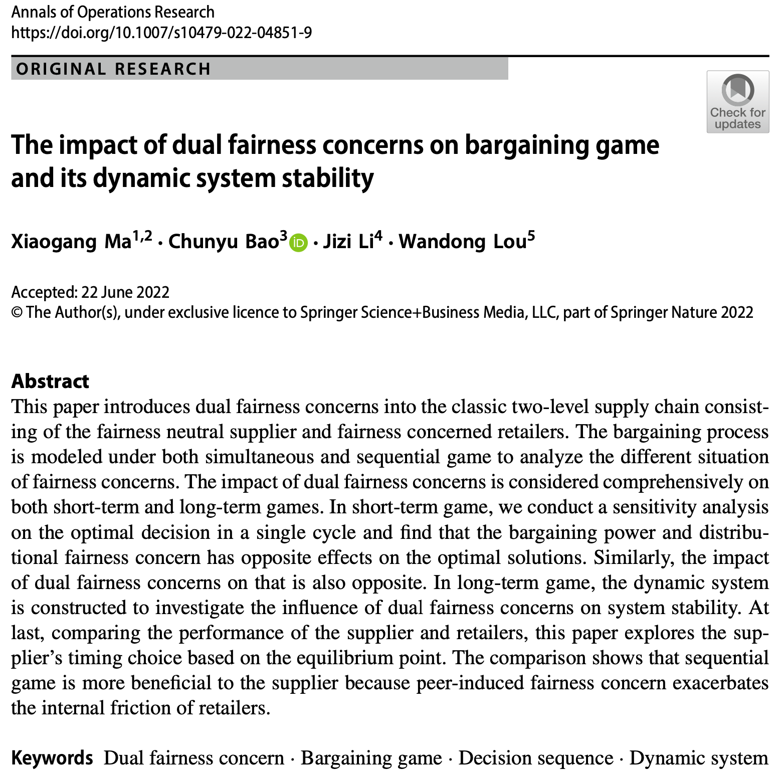 近日,太阳集团网tyc9728马小刚博士与其硕士生包春玉的合作论文“The impact of dual fairness concerns on bargaining game and its dynamic system stability”在管理科学领域国际权威期刊Annals of Operations Research在线发表。文章DOI:https://doi.org/10.1007/s10479-022-04851-9。太阳集团网tyc9728为该论文第一作者单位。