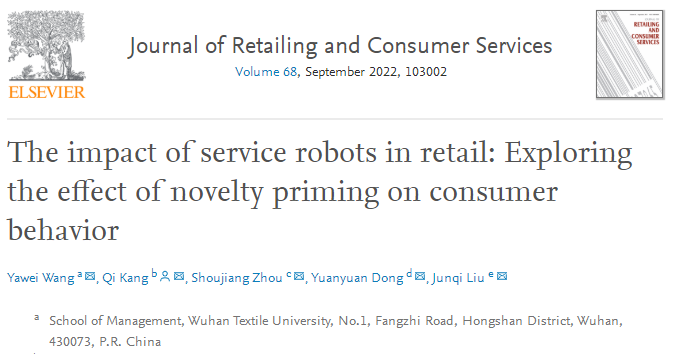 近日,国际管理学领域期刊《Journal of Retailing and Consumer Services》发表我校太阳集团网tyc9728王涯薇博士在市场营销-服务业管理领域取得的重要成果:“The impact of service robots in retail: Exploring the effect of novelty priming on consumer behavior”。文章DOI: https://doi.org/10.1016/j.jretconser.2022.103002。太阳集团网tyc9728为该论文的第一作者单位。