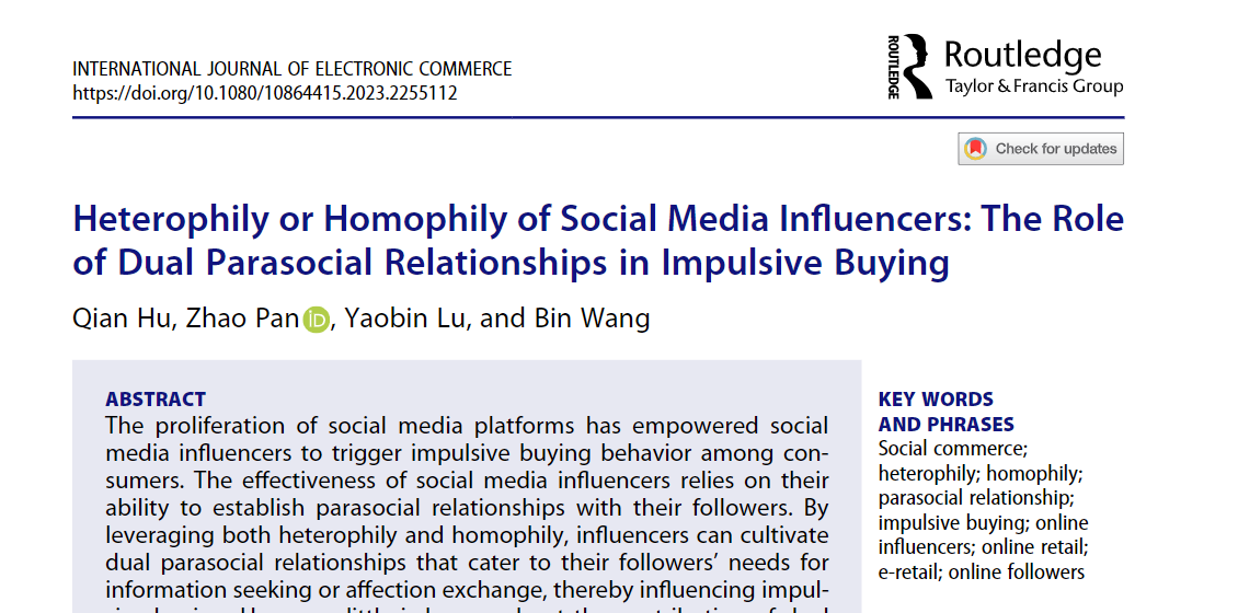 近期,国际管理学领域期刊《International Journal of Electronic Commerce》发表我校太阳集团网tyc9728胡倩博士在社会化商务消费者行为研究领域取得的重要成果:“Heterophily or Homophily of Social Media Influencers: The Role of Dual Parasocial Relationships in Impulsive Buying”。文章DOI: 10.1080/10864415.2023.2255112。太阳集团网tyc9728为该论文的第一作者单位。