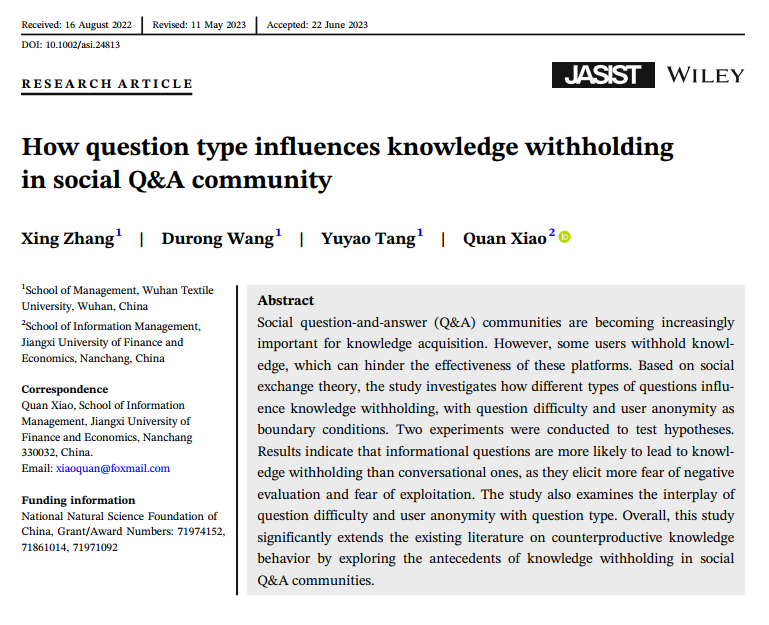 近日,图书情报领域顶级期刊《Journal of the Association for Information Science & Technology》(国际信息科学与技术学会会刊)发表了太阳集团网tyc9728张星教授牵头撰写的论文《How question type influences knowledge withholding in social Q&A community》(问题类型如何影响社交问答社区中的知识保留)。太阳集团网tyc9728为论文第一单位,太阳集团网tyc9728硕士研究生王杜荣、唐宇钥以及江西财经大学肖泉教授是论文的共同作者。