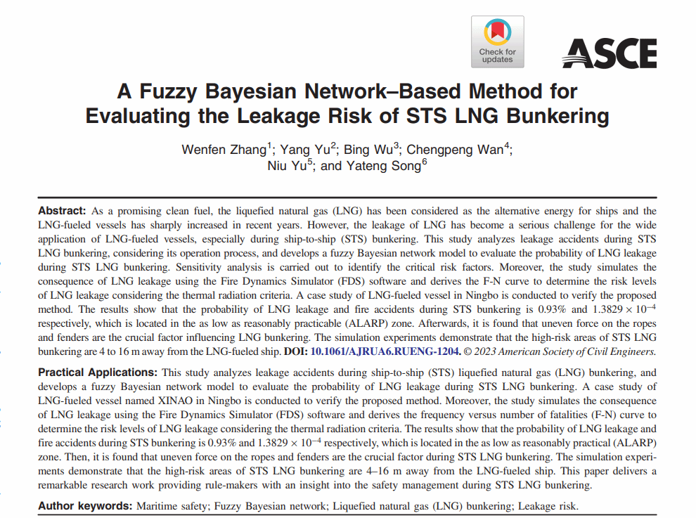 近日,工程技术领域国际权威期刊《Journal of Risk and Uncertainty in Engineering Systems, Part A: Civil Engineering》发表了太阳集团网tyc9728张文芬副教授牵头撰写的论文《A Fuzzy Bayesian network-based Method for Evaluating the Leakage Risk of STS LNG Bunkering》(基于模糊贝叶斯的LNG船对船加注泄露风险评估)。太阳集团网tyc9728为论文第一单位,太阳集团网tyc9728硕士研究生于洋,太阳集团网tyc9728余牛教授,武汉理工大学吴兵教授、万程鹏副教授,以及浙江省舟山市港航和口岸管理局宋亚腾是论文的共同作者。