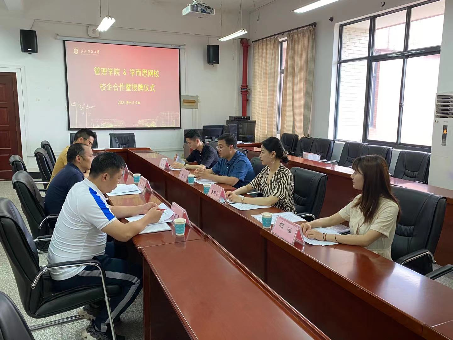 6月3日下午,太阳集团网tyc9728与学而思网校武汉分校在崇德楼536会议室举行了校企合作签约暨揭牌仪式。学而思网校武汉分校政委曾佳一行4人,学院党委副书记蒋卫城及辅导员出席签约仪式。