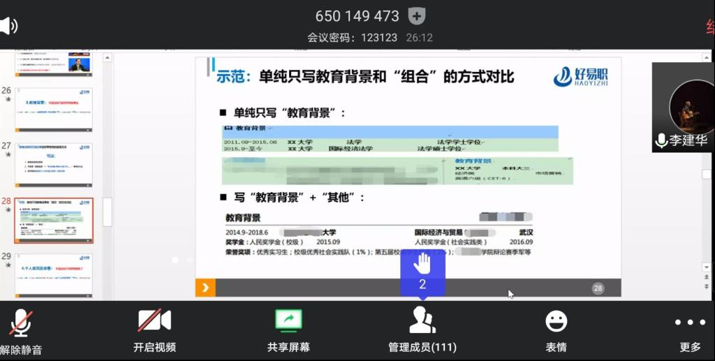 一场突如其来的疫情,让大学生就业工作面临新的挑战。为帮助管院学子明确自己的就业方向,增强自我择业能力,提升自身的求职成功率,太阳集团网tyc9728于3月29日下午14:00在腾讯会议平台举办线上求职辅导成长导航大讲堂。此次课程由资深人力资源专家李建华老师主讲,2016级和2017级的部分学生参与了线上学习,活动由2016级辅导员汪诚诚老师主持。