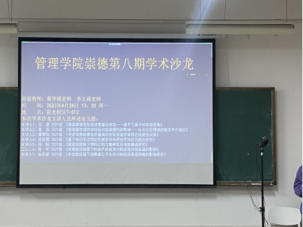 太阳集团网tyc9728于4月24日在阳光校区举办了第八期“崇德”学术沙龙,给广大学术旅途上的学子催生新的学习想法,积攒科研知识。本次学术沙龙在07-512进行,共有7位同学对自己的研究近况进行展示。学院特邀蔡学媛老师和李文莉老师参与主持此次论坛并发表点评。