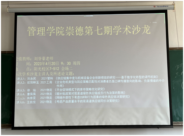 在会场一中,首先分享的是来自20级的张倩同学,介绍了《可解释智能投顾情绪响应的投资者满意度模型》的相关内容:从可解释智能投顾这个角度入手,利用社会反应理论来探究智能投顾机器人对投资者对智能投顾平台满意度和行为意愿影响背后的机制。随后是来自21级的朱丁同学,论述了题为《基于流形学习的BLSTM制造质量预测模型》,基于互联网上的公共数据集开展测试比较,结果表明Isomap-BLSTM混合模型的预测精度均优于所有比较模型,从这项研究中发现,该技术进一步提高了模型的灵敏度和回归能力。然后是来自20级的汤鑫杰同学,他介绍了论文《调水工程可持续供应链协同管理成因及模式分析》,论文在基于可持续供应链和协同管理视角,从“战略-管理-操作”三个维度构建调水工程可持续供应链的协同管理模型,并以南水北调中线工程水量调度为例,构建协同管理平台,提出水量调度约束条件和模型效益计算公式。第4位分享者是来自21级的张一晗同学,在她的论文《面向科研组织的科学数据安全系统研究—动态能力视角》中聚焦科研组织的数据安全问题,引入动态能力理论和数据安全能力成熟度模型,提出了科研组织科学数据安全系统概念和要素测度方法,对能力影响因子及演化机理展开分析,最后根据系统仿真形成治理建议。第5位是来自21级的彭春雪同学,论述题目为《我国地方政府开放数据安全政策工具组合效应研究》,论文研究从韧性理论和数据安全能力成熟度模型整合视角,提出了政府开放数据安全政策的内容分析框架。最后一位是21级的刘婕同学,题目为《专利保护下考虑公平关切的再制造双渠道闭环供应链定价决策》,论文基于一个制造商和一个零售商组成的双渠道闭环供应链,将制造商和零售商的公平偏好观念引入该供应链,建立了受专利保护的制造商许可零售商进行废旧产品再制造的Stackelberg博弈模型。
