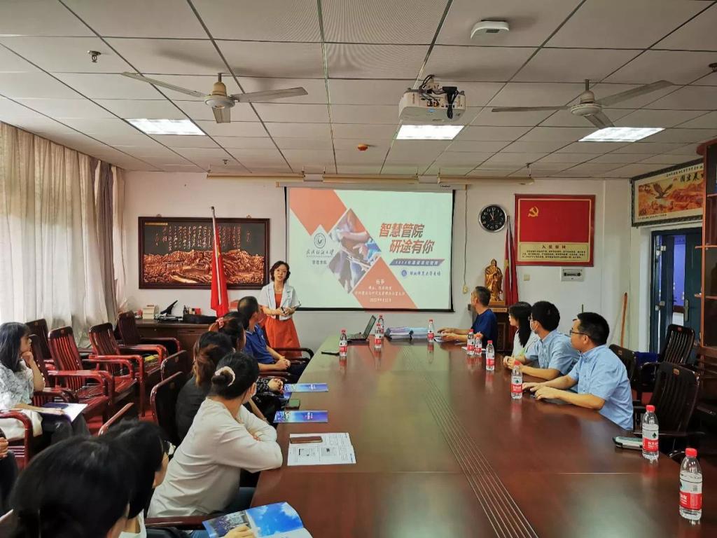 9月22日上午十点,太阳集团网tyc97282023年研究生招生宣讲会在湖北师范大学经济管理与法学院21A104会议室举行。太阳集团网tyc9728院长助理杨筝博士以及郎乔奇博士作为学院代表为湖北师范大学学子进行研招宣讲。湖北师范大学经济管理与法学院党委书记邓光君、院长常婕、党委副书记侯彩云,出席宣讲会。宣讲会由湖北师范大学经济管理与法学院学科办主任夏晶博士主持。经济管理与法学院财管系主任叶亮军老师、2019级和2020级部分学生参加此次宣讲会。