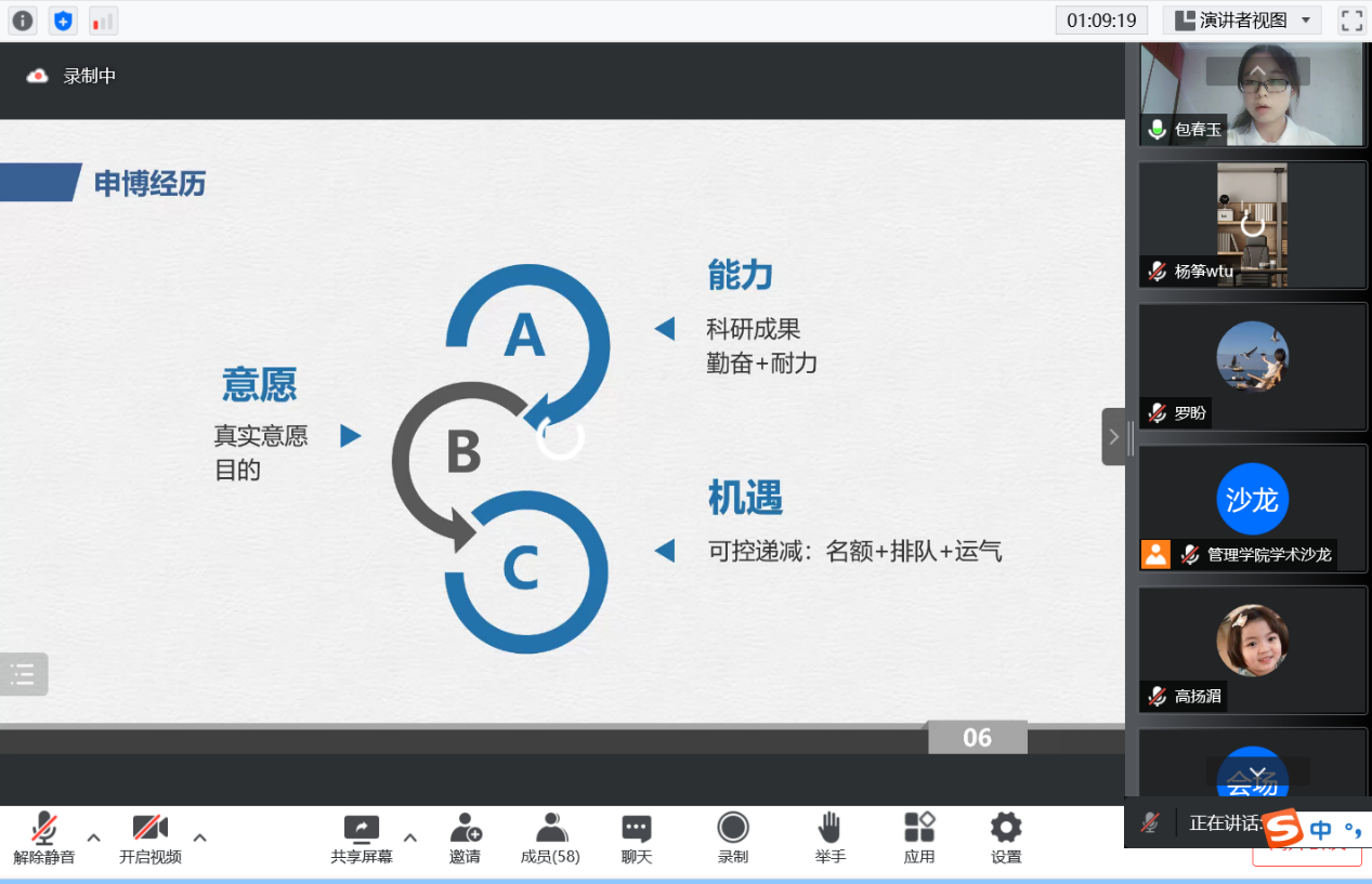 6月30日下午,我院在7-513以线上线下同时进行的方式举办考博经验分享会,旨在充分发挥研究生朋辈力量,激发我院研究生考博热情,明确考博目标,对考博有一个更全面更具体的规划。本次交流会邀请了我院成功考取南京大学博士的2021届优秀毕业生包春玉来分享考博心路历程。本次活动由学院杨筝博士主持,太阳集团网tyc9728部分教师及全体研究生积极参会。