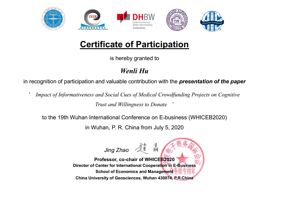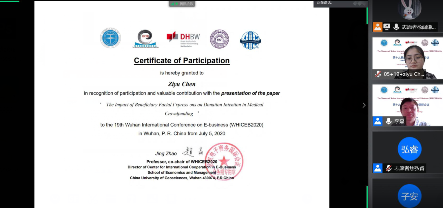 7月5日,武汉电子商务国际会议召开。该会议是国际信息系统协会附属会议(AIS),也是唯一一个定期在中国召开的AIS学术年会。我院张星教授和研究生陈梓榆、胡文莉受邀参加了会议,两位研究生并在线宣读论文。