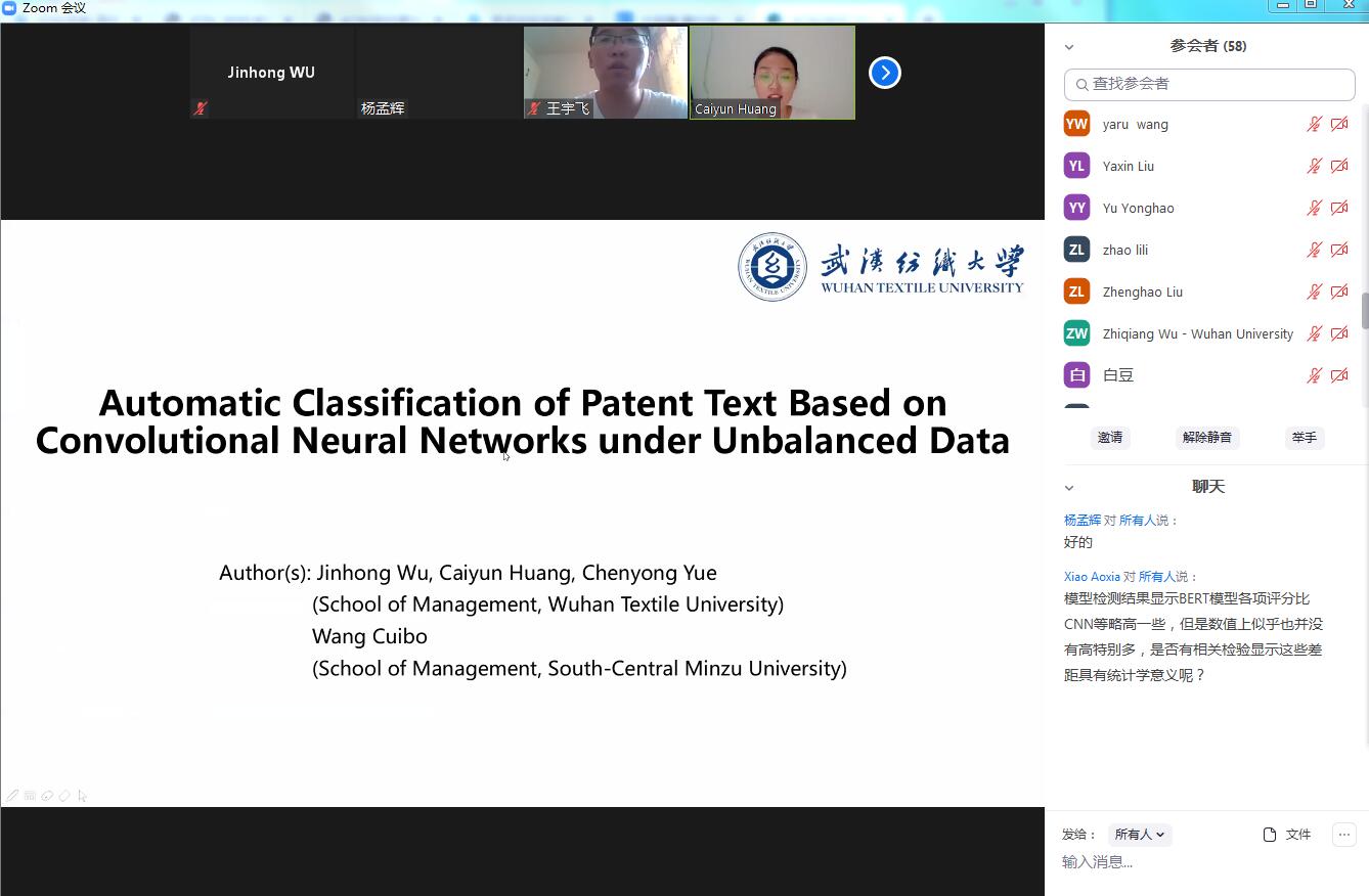 8月5日,我院吴金红教授、陈勇跃教授和研究生黄彩云参加了ACM/IEEE数字图书馆联合会议(Joint Conference on Digital Libraries,JCDL)(JCDL 2020)。研究生黄彩云宣读了题为《Automatic Classification of Patent Text Based on Convolutional Neural Network Under Unbalanced Data》的最新研究成果。在数据不均衡的情况下,研究团队通过各种欠采样、过采样以及综合采样的方法来均衡数据后,利用卷积神经网络进行专利文本自动分类研究,探究非均衡数据自动分类的影响因素及相关解决方案。