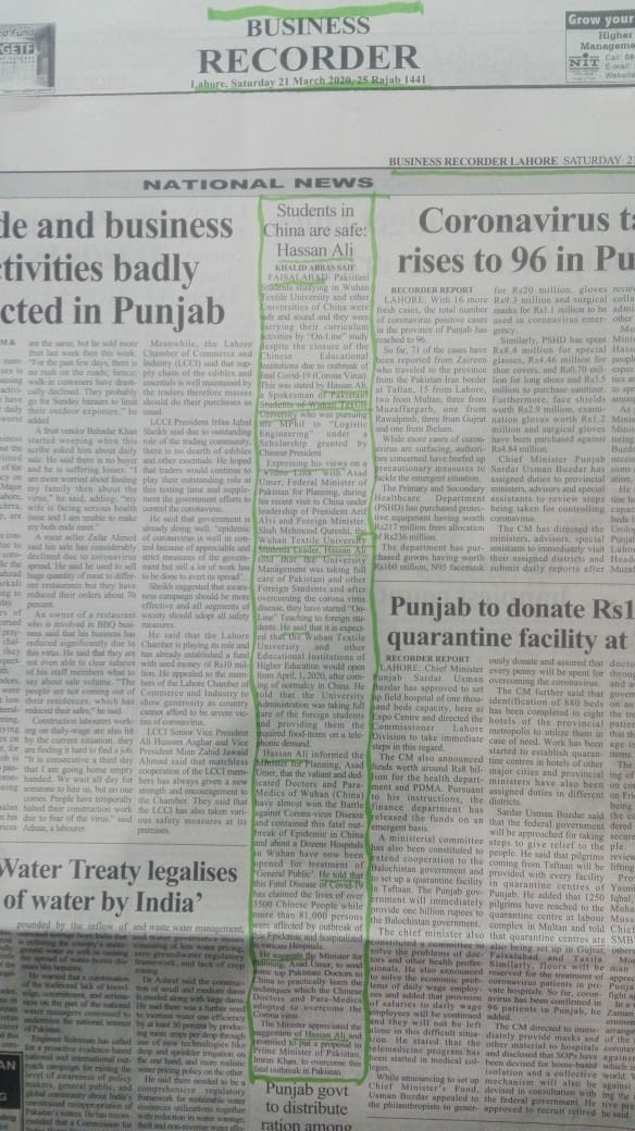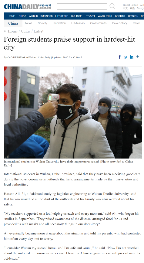 2020年,武汉新冠疫情暴发以来,太阳集团网tyc97282019级物流工程与管理专业留学生哈森·阿里(Hassan Ali)一直坚守在武汉,并没有撤离回到巴基斯坦,见证了武汉疫情从暴发到被控制的全过程,亲历了疫情期间中国政府的防控举措。在此过程中,哈森·阿里一直相信中国政府,密切配合学校做好防控工作,并积极向巴基斯坦报社投稿,宣传中国的疫情防控措施,还通过视频连线向巴基斯坦计划发展和改革部长阿萨德·奥马尔汇报武汉巴基斯坦留学生的生活和健康状况。哈森·阿里接受了巴基斯坦三家报纸的采访,和China daily英文版驻汉记者的采访。